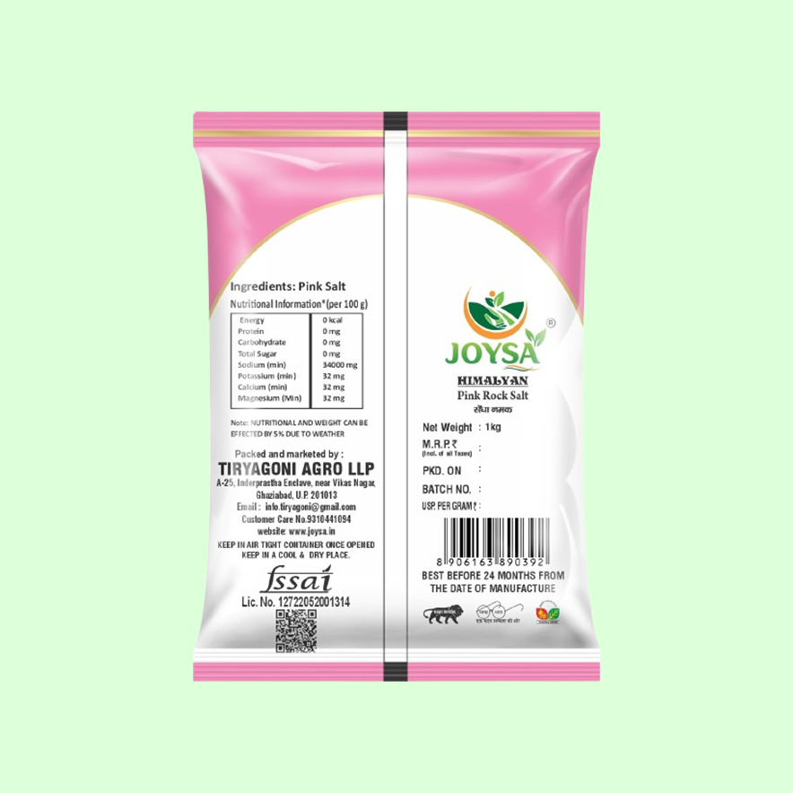 Joysa Himalayan Pink Salt, has distinctive pink hue and rich mineral content, which is free from additives, preservatives, and chemicals—just nature in its truest form. Ideal for everyday cooking or as a finishing salt, it enhances flavors while offering essential minerals like potassium, magnesium, and calcium. Also known as Sendha Namak which improves the gut health, reduces stress, controls blood pressure and many more benefits